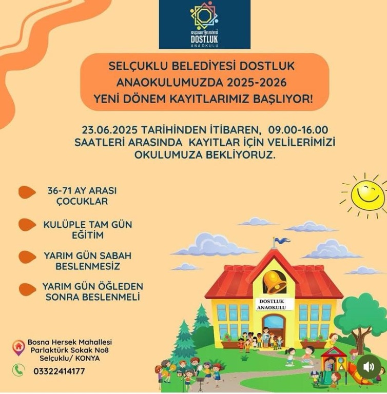 Okul Öncesi öğrenci kayıtları 1 Temmuz 2025 tarihinde başlayacaktır. Anaokulumuza kayıt için başvuracak öğrencilerimizin velileri 1 Temmuz 2025 Salı gününden itibaren okulumuza gelerek çocuklarının kayıtlarını yaptırabilirler.